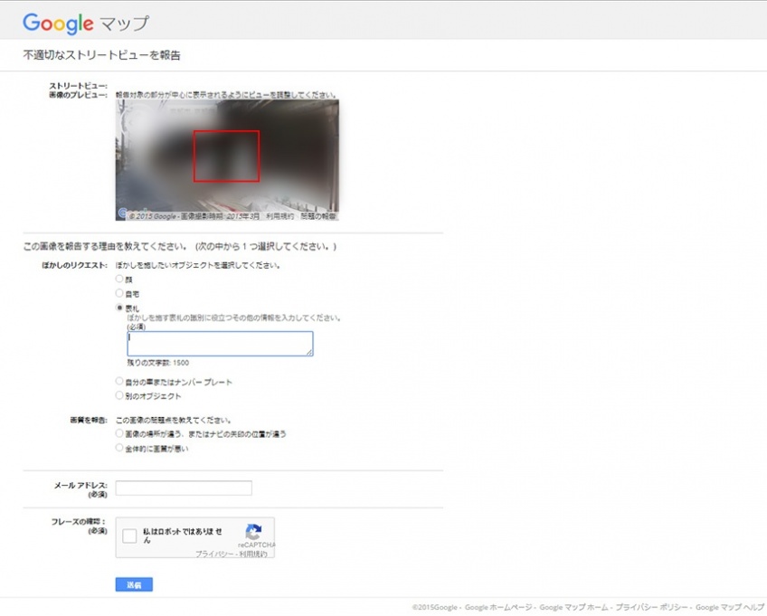 ということで、Googleマップのストリートビューで削除依頼をしてみました。