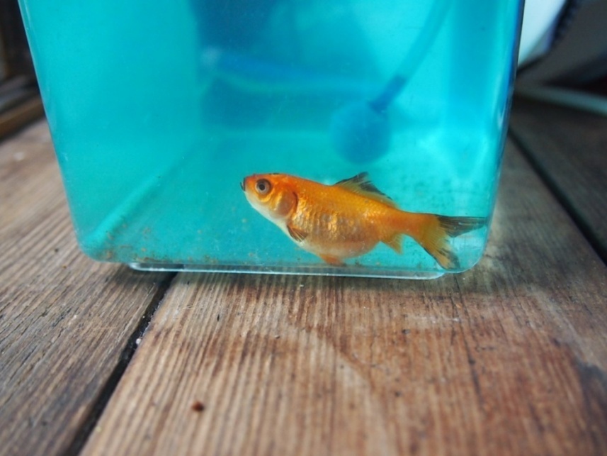 その中で、今年の春にみやこめっせのイベントの金魚すくいでゲットした、昭和のドロさんひげ風模様が付いている和金が、先輩方の巨大和金水槽の中で頑張っていたのですが、先日から様子が変。