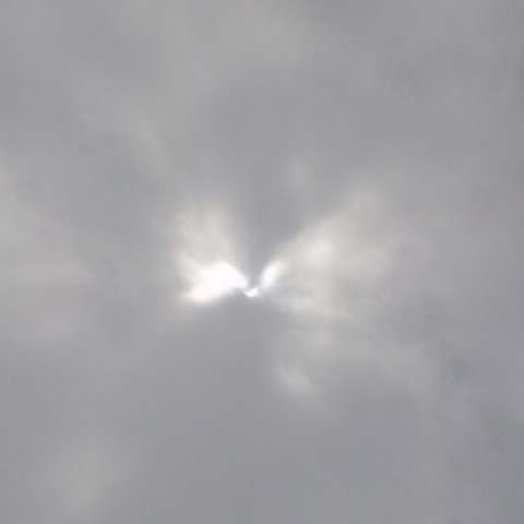 図書館に行っての帰り、空を見上げたら、雲の陰から見えているではないですか!! さっそくデジカメ&ケータイ写したけど、上手く撮れない?! 日食...