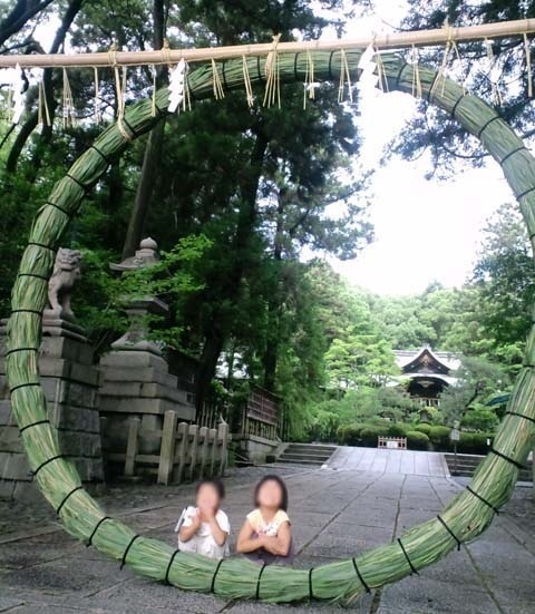 が、夕方もくれていたので、3回体にこすりこすりした家族の人数分の人型の紙(というのか?)を納めることができず、<strong>茅の輪潜り(ちのわくぐり)</strong>をやってきました。